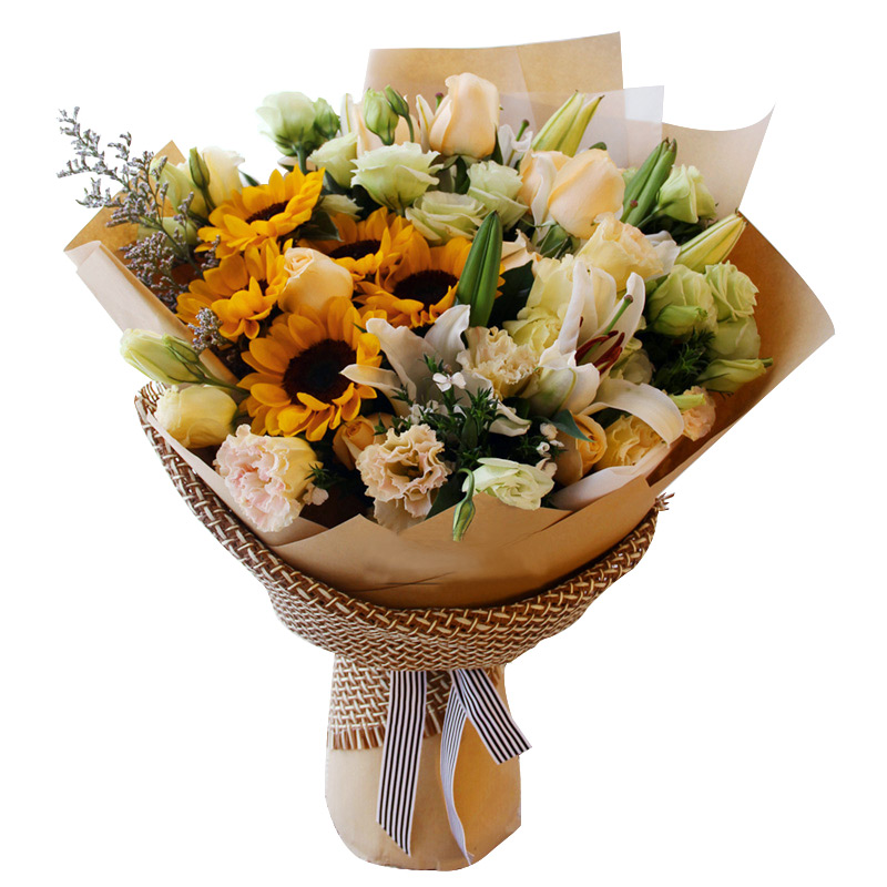 花 材:9朵香槟玫瑰,1朵向日葵,2支多头白色香水百合,5支橙色泡泡,5支洋桔梗,搭配尤加利叶装饰。