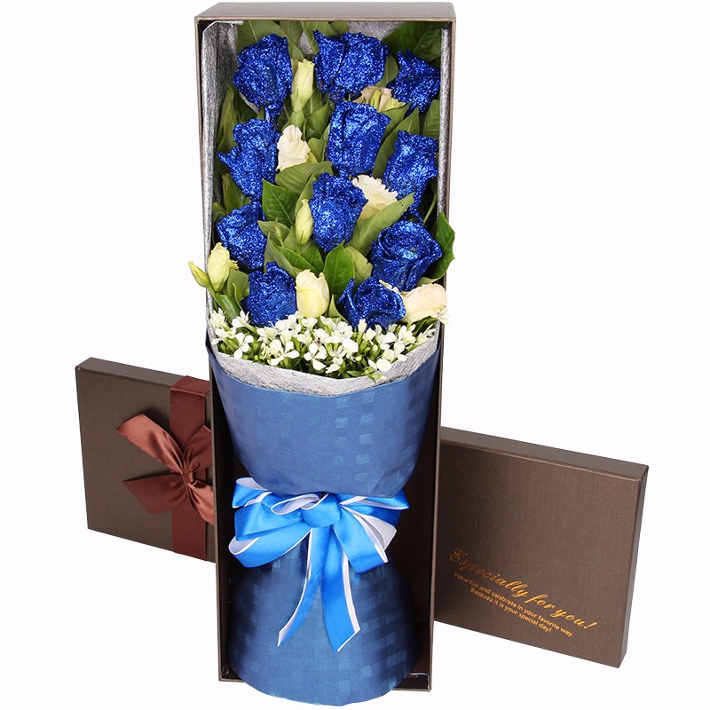 花 材:11支精品蓝色妖姬,搭配适量白色洋桔梗、栀子叶、白色相思梅。