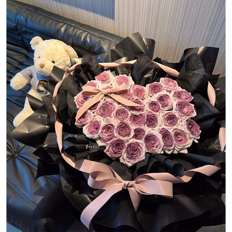 包装: 黑色雪梨纸,黑色欧雅纸包装,用粉色丝带穿插造型。(注:小熊为拍摄道具,此花不含小熊)