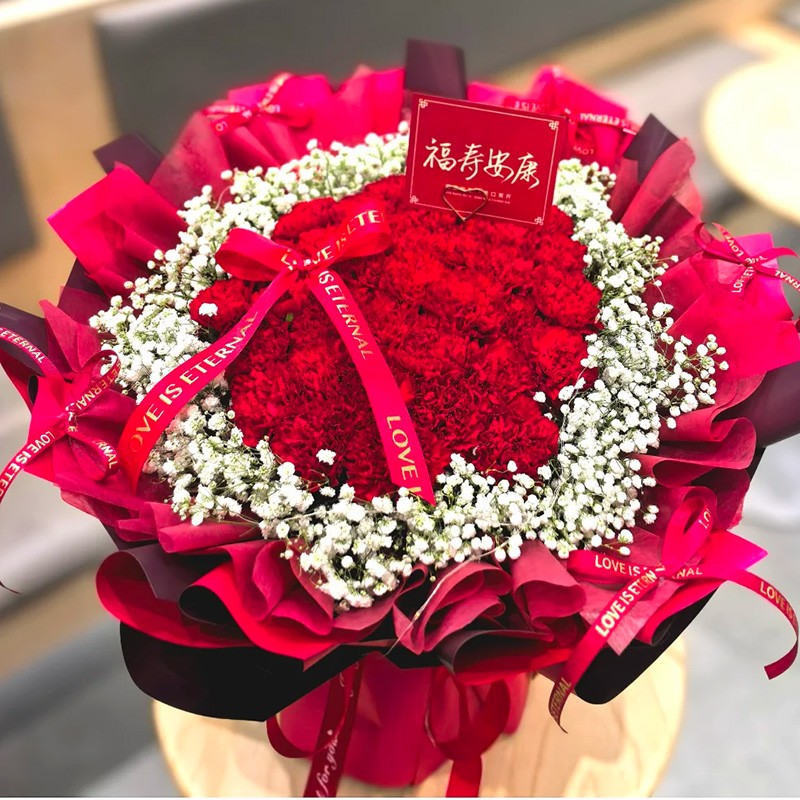 花材: 33枝精品红色康乃馨,白色满天星围边丰满环绕,红色蝴蝶结装饰花面。