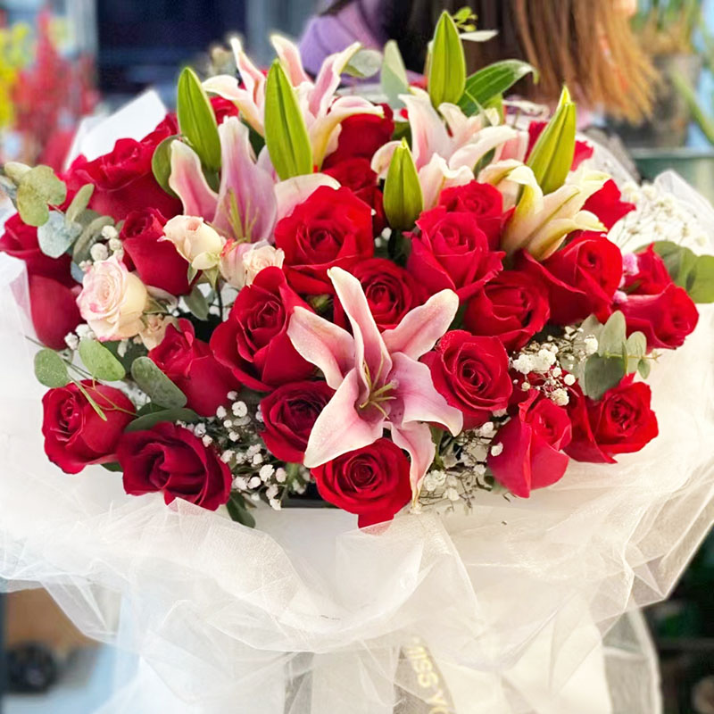 花材: 33朵红玫瑰,4支多头粉色香水百合,搭配尤加利叶、满天星装饰。