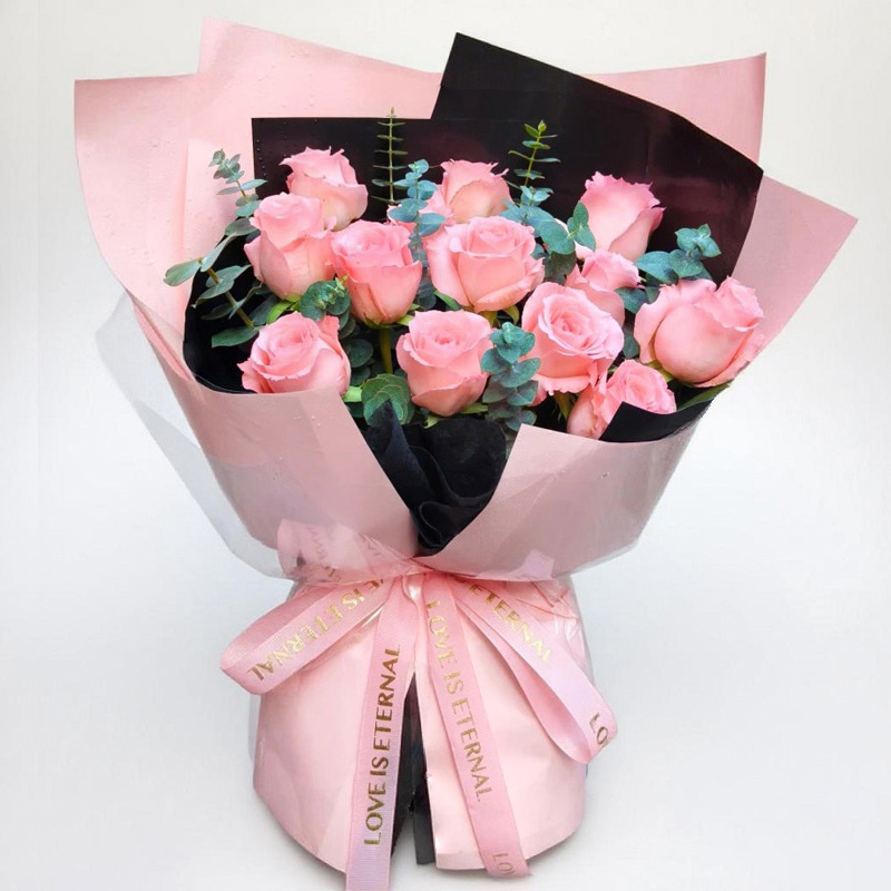 花 材:12朵粉玫瑰,搭配尤加利叶装饰。