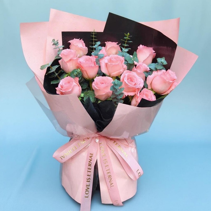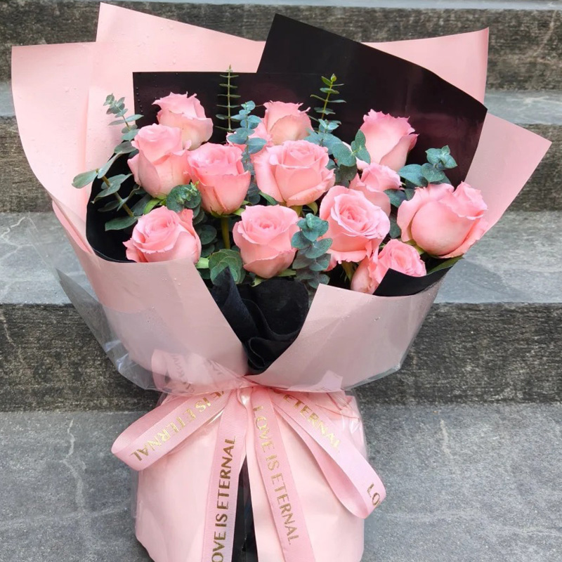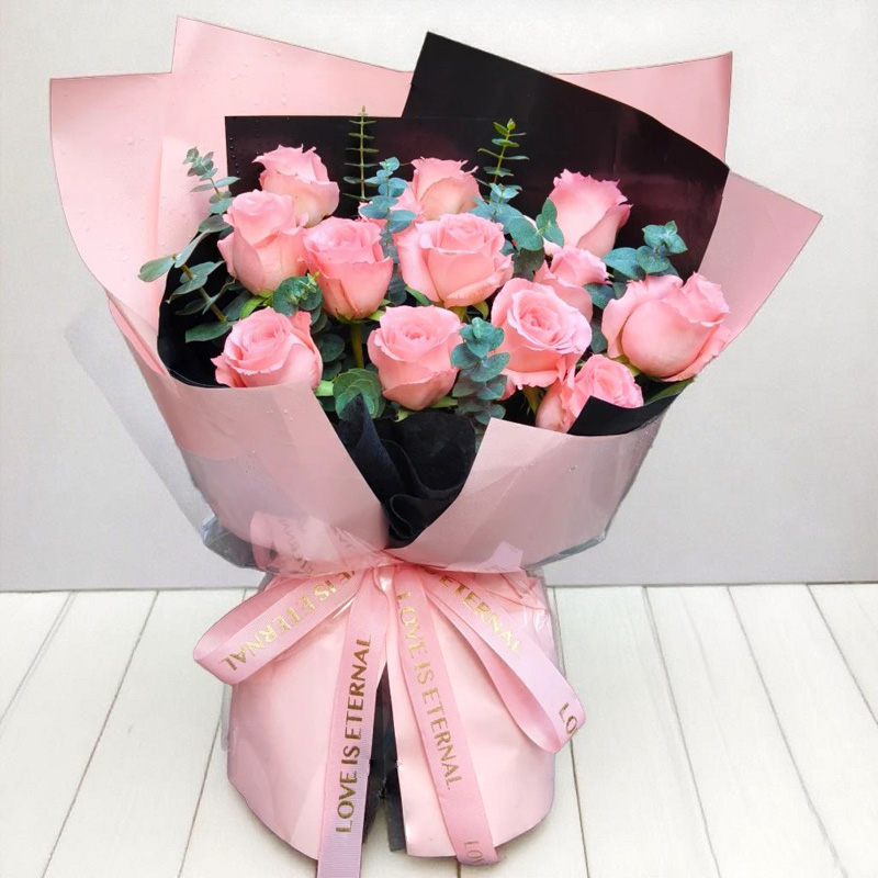 花材: 12朵粉玫瑰,搭配尤加利叶装饰。