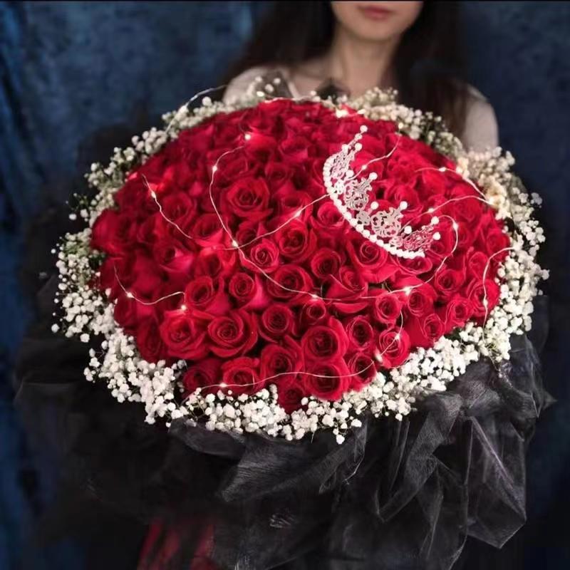 花 材:精选99朵红玫瑰,2条灯带,1个皇冠(款式随机),外围满天星环绕。