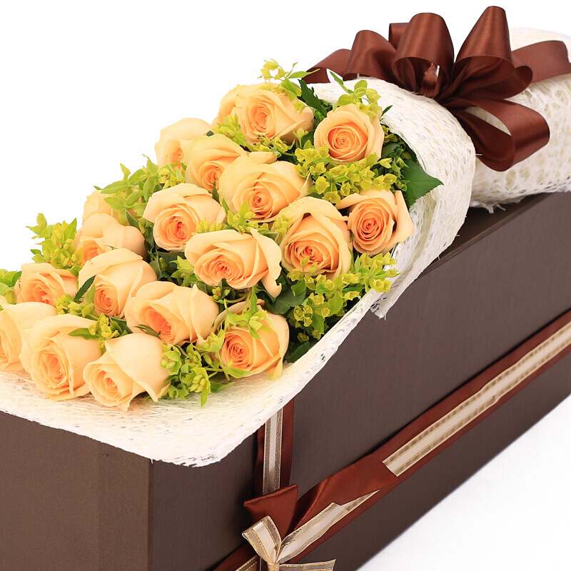 花材: 精选19朵香槟玫瑰,搭配叶上黄金点缀。