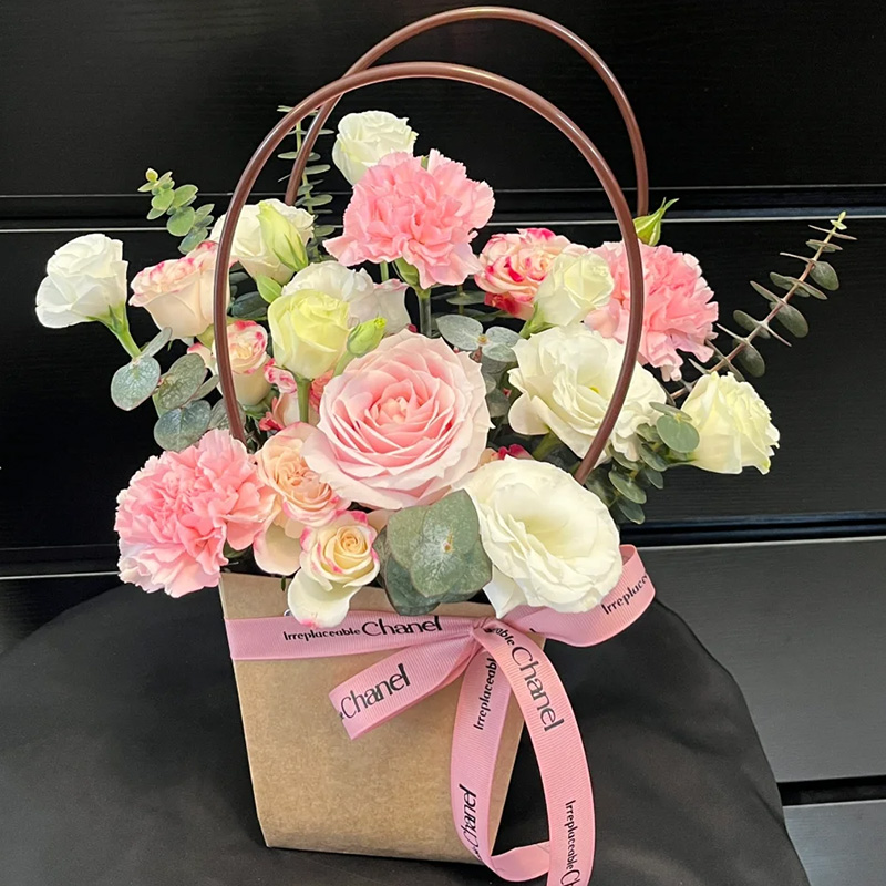 花材: 精选4支粉色康乃馨、粉玫瑰混搭,4支多头洋桔梗,4支粉色折射玫瑰,搭配尤加利叶装饰。