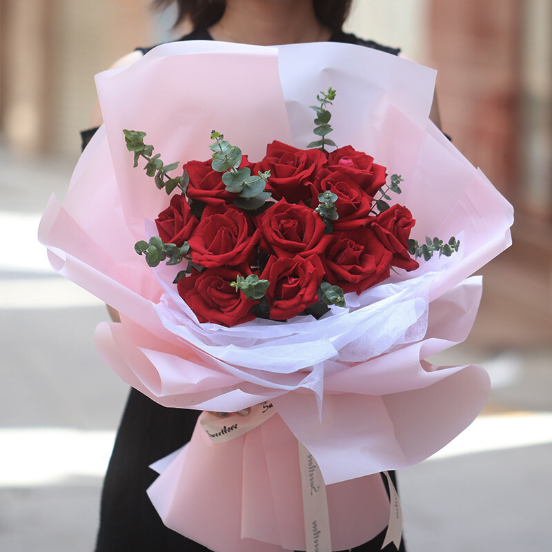 花材: 11枝红玫瑰,1个珍珠皇冠(款式随机),1条串灯,搭配白色满天星。