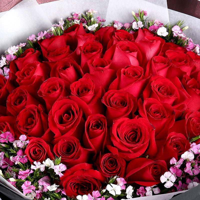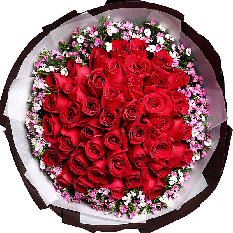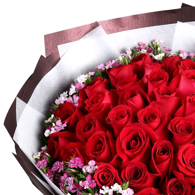 花材: 33朵红玫瑰,搭配石竹梅外围点缀。