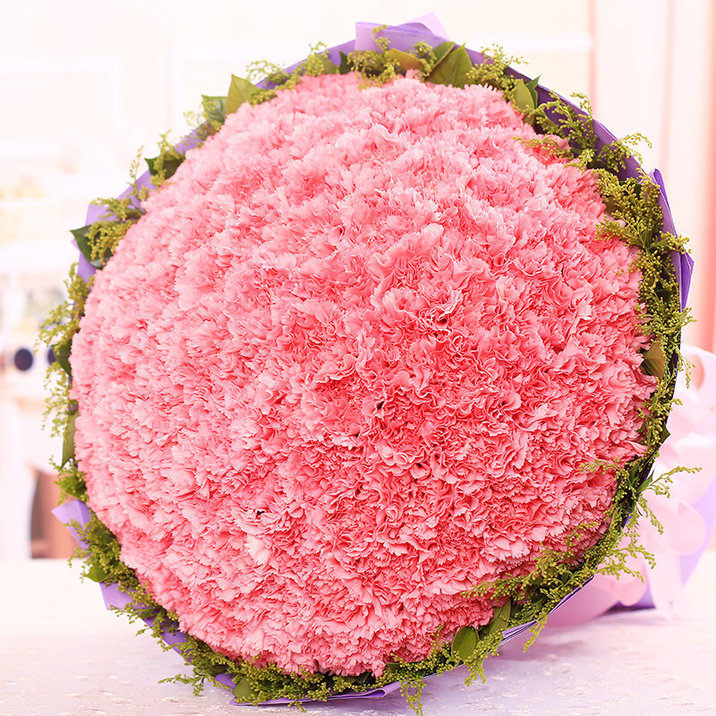 花材: 99支粉色康乃馨,搭配绿叶、黄莺。