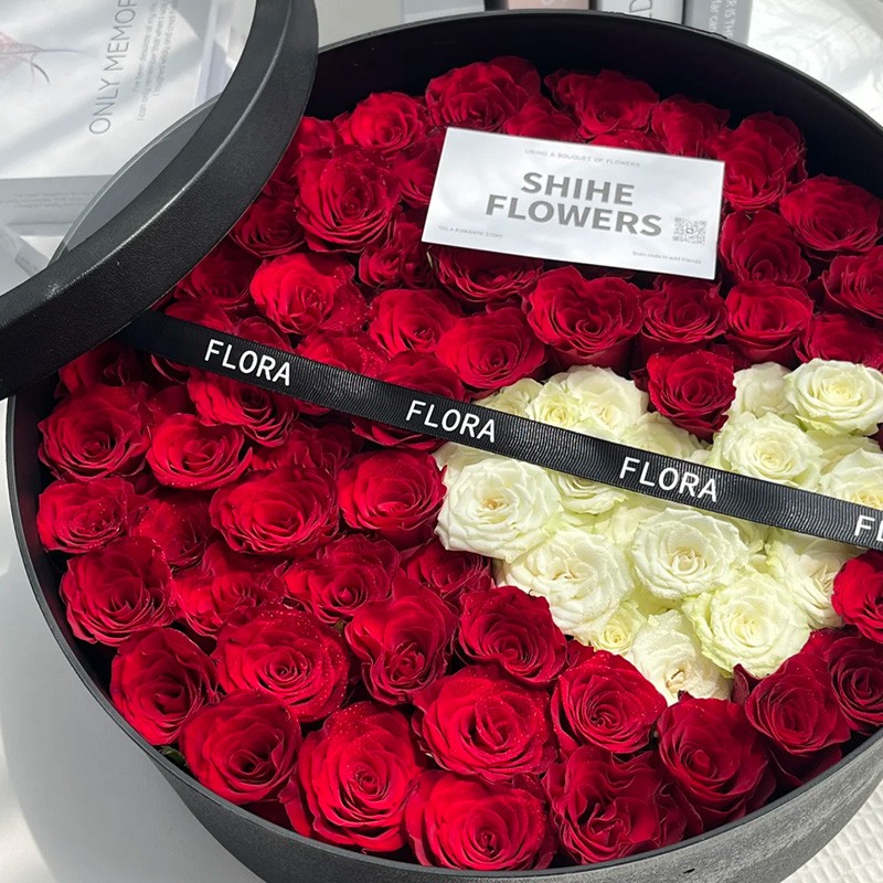 花 材:精选60枝红玫瑰,15枝白玫瑰(白玫瑰心形造型),一条缎带装饰花面。