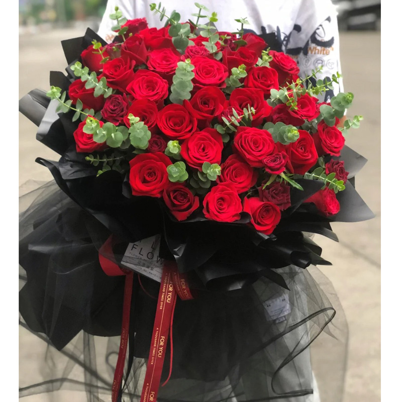 - 花材33朵红玫瑰,6支红色多头红玫瑰(断货则用同数量橙色泡泡或者洋桔梗代替),尤加利叶间插。